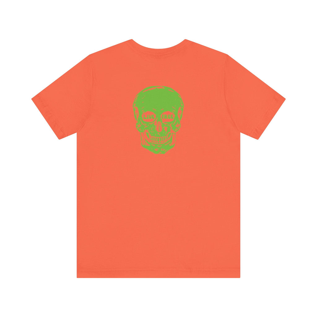 This skull print T-shirt delivers streetwear attitude with a sharp, modern edge. Featuring a striking green live-free skull graphic on the back, this design transforms a casual tee into a bold statement piece.