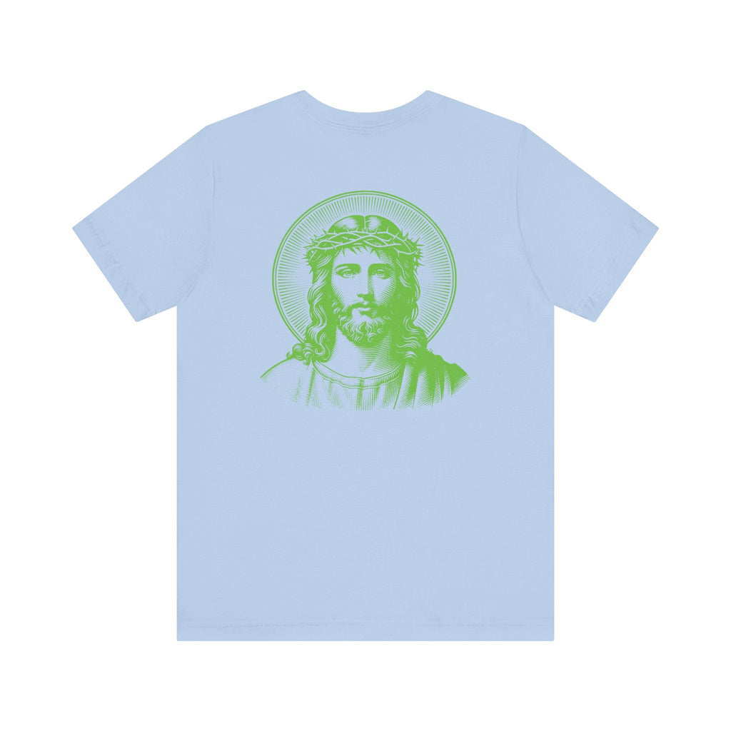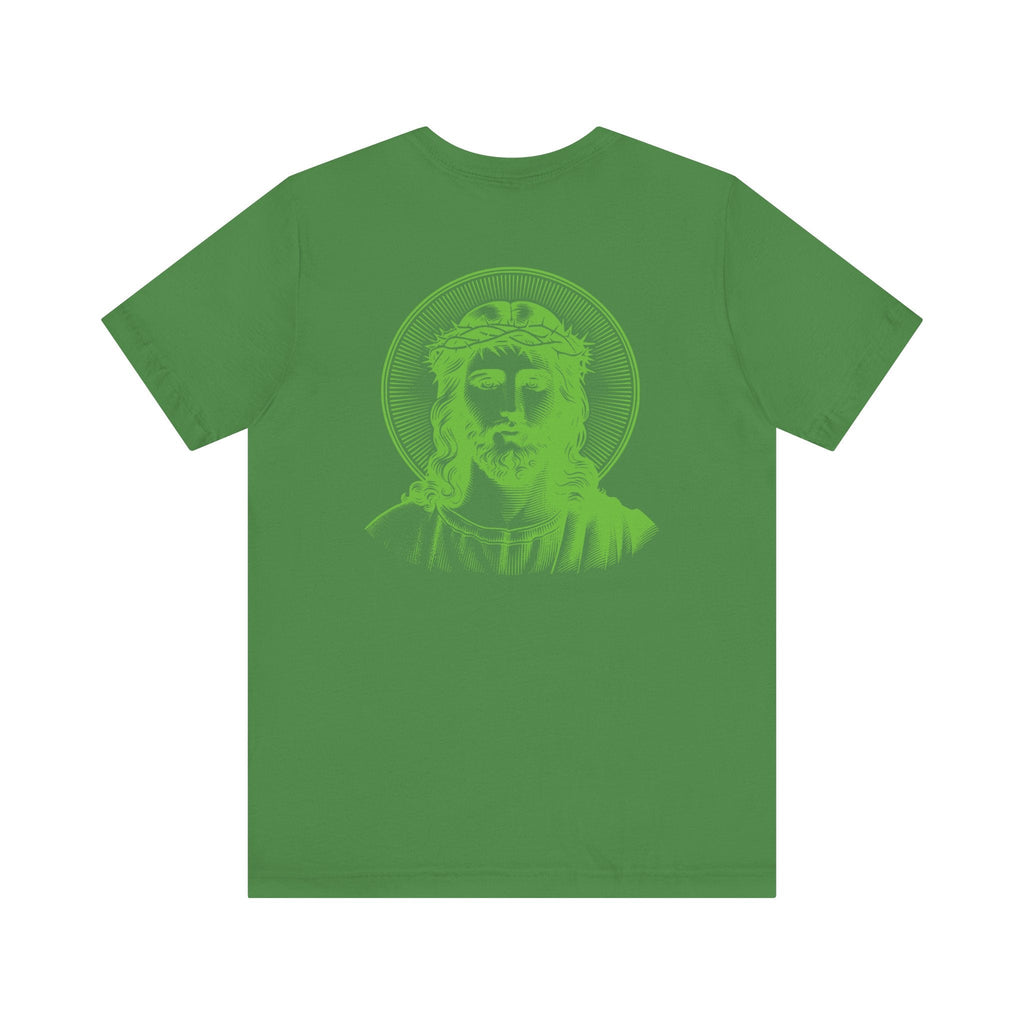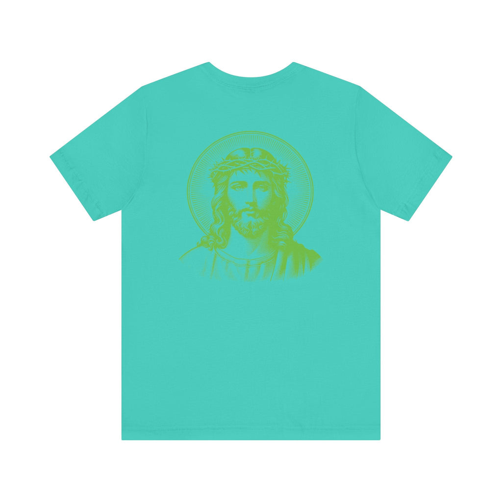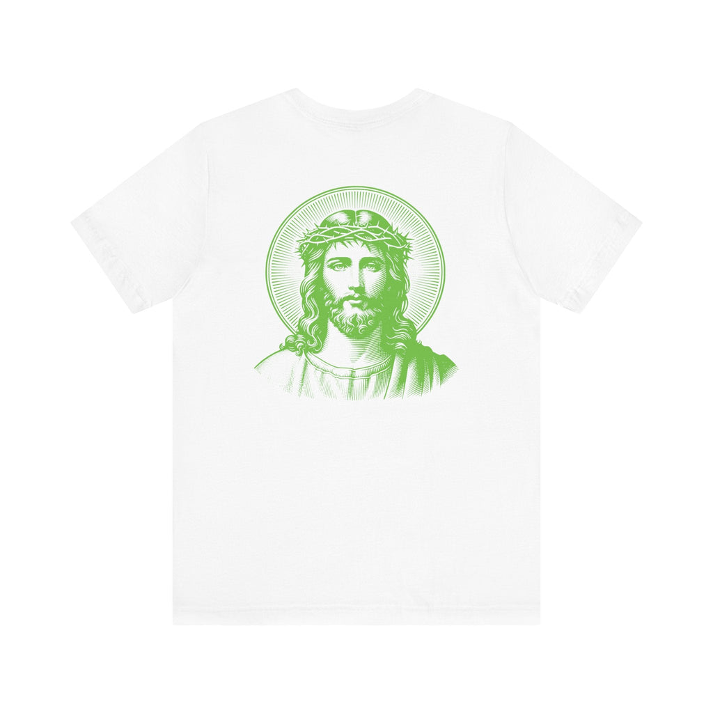 Green Jumbo Halo Jesus Back Print with Green Mini Jesus Front Left Print Graphic Tee - Iconic by Sandra Oles