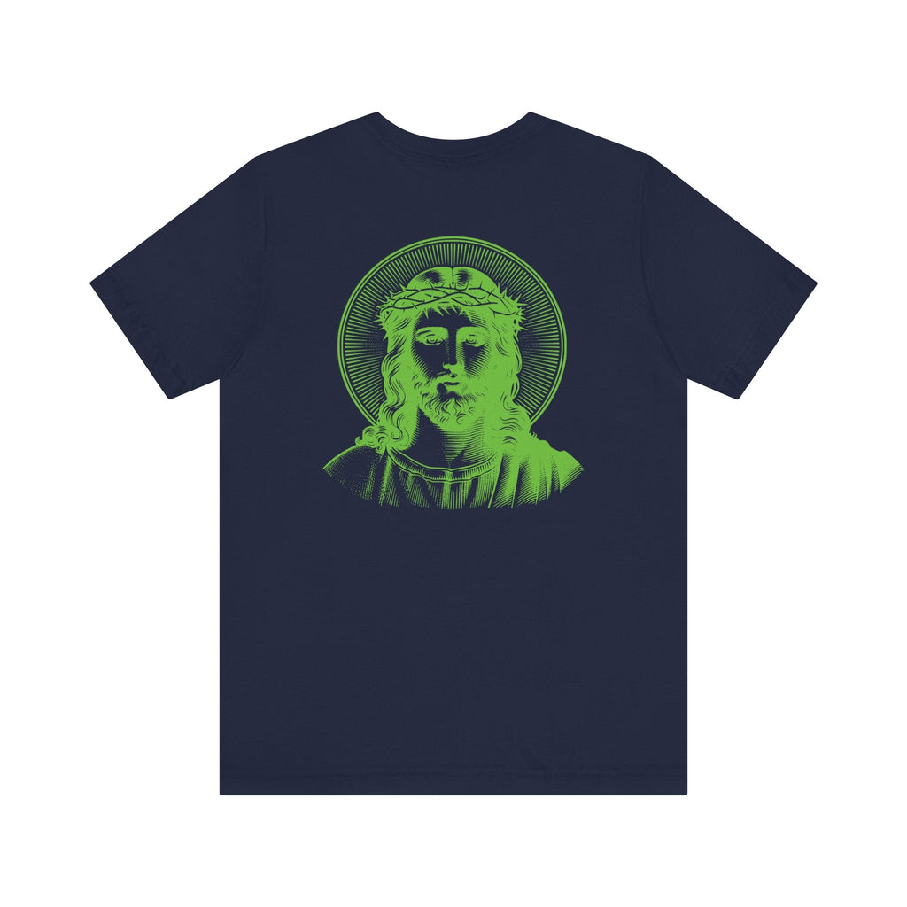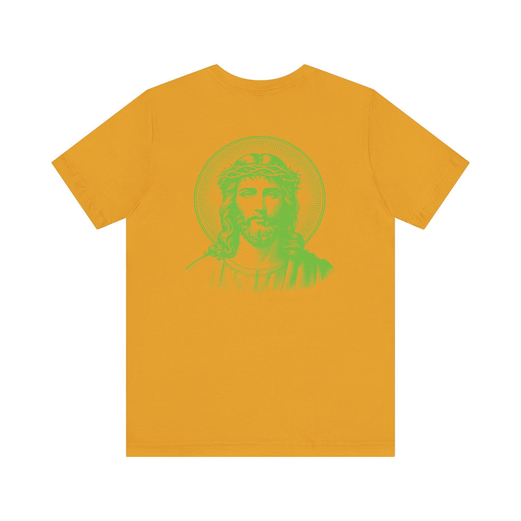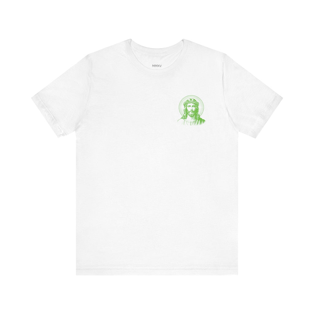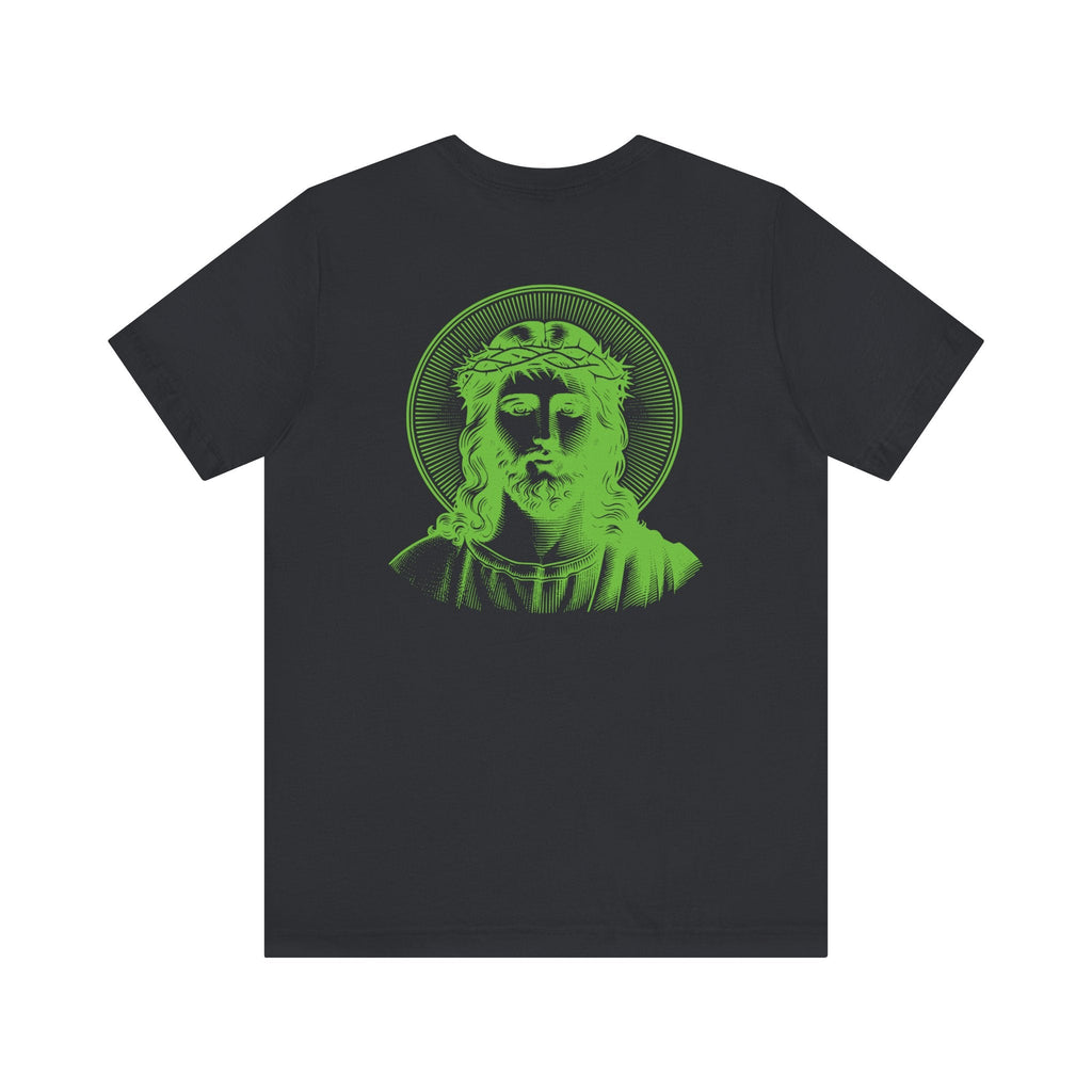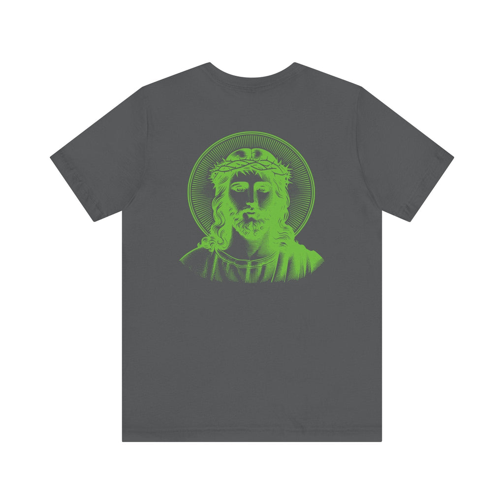 Green Jumbo Halo Jesus Back Print with Green Mini Jesus Front Left Print Graphic Tee - Iconic by Sandra Oles