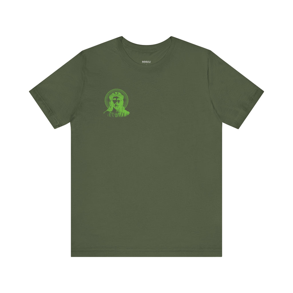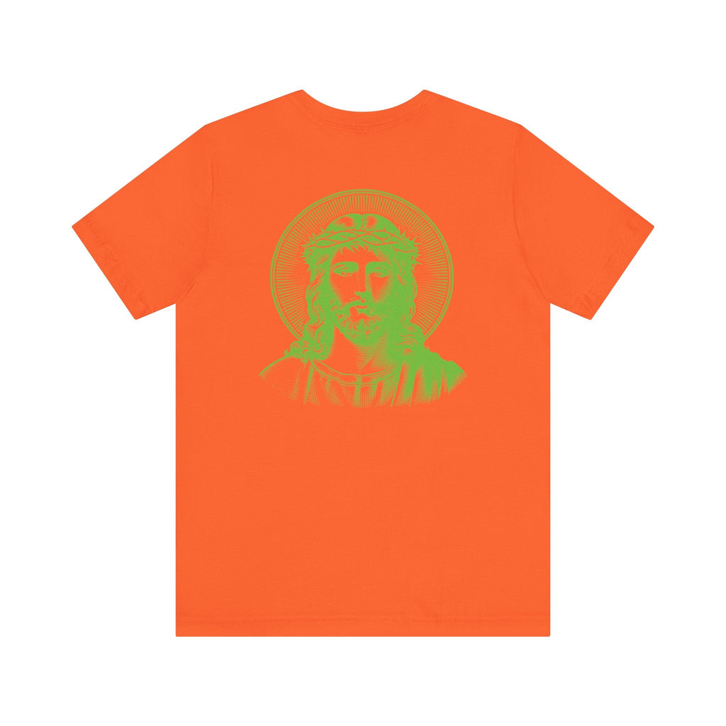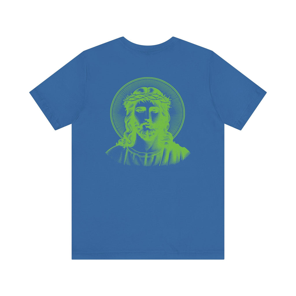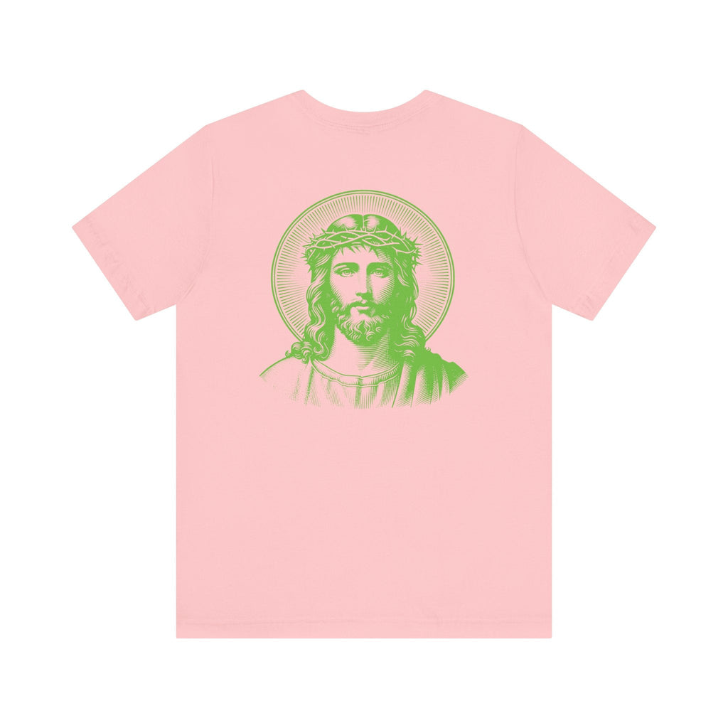 Green Jumbo Halo Jesus Back Print with Green Mini Jesus Front Left Print Graphic Tee - Iconic by Sandra Oles